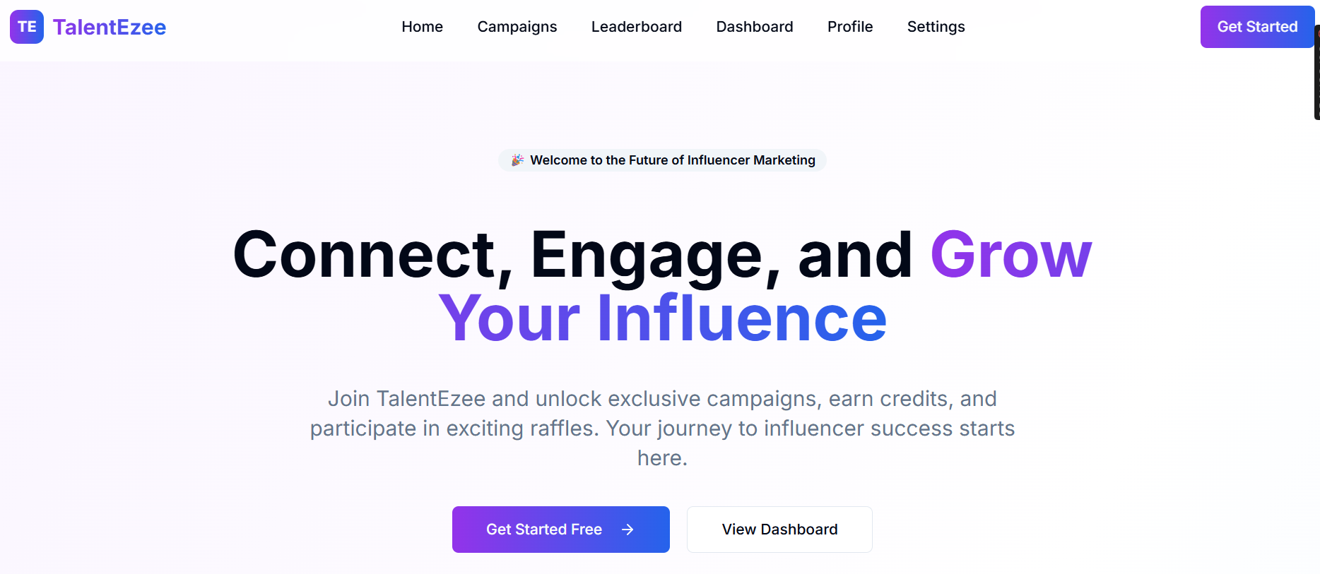 TalentEzee is a modern talent engagement platform built with Next.js 14 and Tailwind CSS. It features influencer onboarding, campaign management, leaderboards, Stripe-based wallet top-ups, and a raffle reward system—all wrapped in a sleek glassmorphism UI. Designed for scale, it combines design excellence with strong technical performance for seamless talent–brand collaboration.